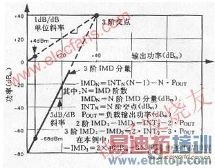 因为已知3阶IMD的幅值斜率(3 dB/dB),假如它的交点也知道,那么可以估计出任何输入( 或输出)电平的3阶IMD分量。对于高阶交点,直线向右移(斜率相同),图1中示出的是对 于给定输入电平对应较低的3阶分量。