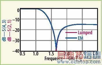 在抽取出宽带模型,获得内嵌电容和电感后,低通滤波器例子的最终布局示于图4。图6针对滤波器插损将EM仿真跟提取的集总部件模型结果进行了比较,集总元件模型与EM模型之间一致性很好。图7把EM仿真响应与测量数据作了对比,结果又一次接近一致。