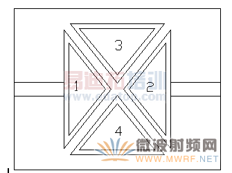 对图3所示滤波器结构进行改进,我们提出了一种电容耦合抽头形式的结构,如图4所示。在输入端50欧姆微带线的末端连接一个长度为中心频率半波长的谐振单元,再通过一个电容耦合把信号耦合到第一个三角形谐振单元上。由于半波长谐振单元两端的场分量比较强,因此分布在第一个三角形谐振单元两角的场分量加强,即传输路径1-3-2和1-4-2耦合系数增大,耦合电容C1和C3加大。如此以来,两个端口之间有三条主要的传输路径,调节各条传输路径的耦合量,使得信号从一端口经不同的路径到达二端口时相位在某个频率点上反向,即产生了一个传输零点。调节这个传输零点的位置可以有效的改善该滤波器的矩形度。观察图4发现,我们对半波长谐振器进行了一小段弯折处理,这是为了不改变其固有谐振频率的情况下调节它与第一个三角行谐振单元之间的耦合量。