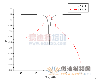 按照图4所示的结构,在三维电磁场仿真软件HFSS里建立仿真模型并进行优化得到如图5所示的仿真结果。该滤波器具有很好的结构对称性,可以很方便的进行建模和优化,优化后得到其主要尺寸如图4所示。其耦合缝宽为0.47mm,易于加工,避免了为减小插入损耗而采取紧耦合从而带来加工困难的问题。