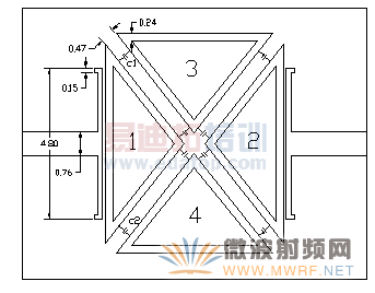 如图1所示,我们选择厚度为0.254mm,介电常数为2.2的RT/Duroid5880介质基片。通过使用三维场仿真软件HFSS,利用本征模求解,得到l为12.5mm时对应的谐振频率为20.5GHz,为我们要求设计的频率。于是我们选取了四个这样的谐振单元构成了结构紧凑的滤波电路,每个谐振单元的周长为12.5mm左右,如图2所示,输入输出端口为标准的50欧姆微带线。