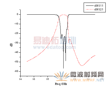 仿真结果显示此种新型结构的滤波器中心频率为20.3GHz,带宽1GHz,带内插损小于0.6dB,回波损耗大于21dB,下边带过渡段在2GHz带宽范围内衰减30dB,而在上边带则有一个传输零点。其总体尺寸为11×8.6mm2。