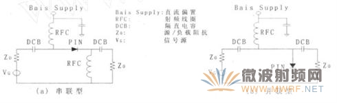 如果用PIN管的C代替图l中的集中电容C5就可能形成微波PIN开关。当PIN管施加反向偏压时,PIN开关处于通过状态,这时输入的微波信号以确定的损耗通过PIN开关,此时有: