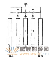 。其中Ci为PIN管的结电容,Cp为管壳电容。当PIN管施加正向偏压时,根据其转换特性,这时梳状滤波器的各个谐振器完全变成一个个失谐结构。它们对输入的微波信号具有完全截止的特性。