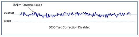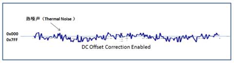 从码域上来看对于一个理想的11 bit ADC,其中间码应该是2^(11-1)=1024。用二进制补码来表示就是0x000。由于二进制补码的最高位表示符号位,所以对应的11 bit 数据范围是从0x000 到0x7FF。0x7FF 表示-1,对应为1023。在无有用信号输入时,理想状态下,11 bit ADC采集出来的信号在码域就应该为0x000。但是事实上外界还有热噪声(thermal noise)与直流偏移会被ADC 采集到。直流偏移在码域上会使ADC 空采所获得的码相对0x000 向上偏移一些,而热噪声信号的自然波动也会叠加到直流偏移所表示的码上面。ADC 的DC offset correction function 会修正直流偏移引起的码域误差,将其重新校正到0x000。