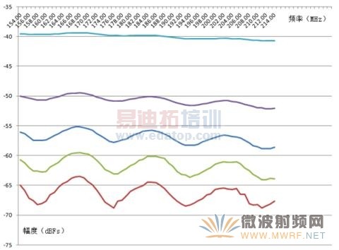 ADS58H40 的采样时钟为 245.76MHz,针对其第二奈奎斯特域的中心 60M 范围,使用 5 个功率等级进行扫频。在功率大于-40dBFs 时,由于 PCB 布局不当所引入的码域翻转干扰对输入信号影响很小(由于 ADC 前端有滤波器的关系,所以输入信号不是完全平整的)。但是随着输入信号功率的减小此干扰对输入信号的影响越来越大,在输入信号幅度低于-60dBFs 时,去除模拟输入端滤波器的影响后其引起的功率误差依然可以达到 3dB 以上。