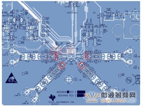(1) ADS58H40 的数据输出 LVDS 线与模拟输入电路分开布局,不要平行或交叉。 (2) ADS58H40 的采样时钟线与随路时钟线布局尽可能的远离模拟输入端,不要与其近距离平行。 (3) ADS58H40 的 VCM 线最好通过过孔直接从模拟输入电路的差分端中间接入,如上图四个红色圈的中心。在模拟输入端 VCM 接入口必须加上对地的滤波电容。VCM 信号不要做成 VCM 电源平面,而且布局时使其尽量远离数据输出线。