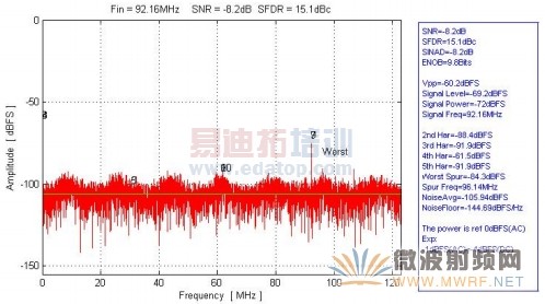 经过 PCB 布局优化的 ADS58H40 使能 DC offset correction function 后不再具有纹波底噪,而且 ADC 底噪更佳(图8)。在-60dBFs 的小信号扫频测试中,去除模拟输入端滤波器的影响后其波动在 0.5dB 以内。