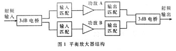 推挽电路形式由两个独立且无任何内部连接的单管放大器构成,通过两个巴伦进行功率的矢量分配与合成。由于巴伦本身具有变阻的特点,因此大大降低了变阻比带来的阻抗匹配的困难,且巴伦对于偶次谐波具有很好的抑制作用。但是由于巴伦两边间隔过小,两路相互影响较大,所以应用巴伦结构的放大器稳定性较差,且该电路的输入和输出驻波比较差。 本文采用平衡放大器的形式,结构如图1所示。其工作原理与巴伦结构的电路相似,但是由于3DB电桥的应用,使得两路射频信号之间隔离较好,有利于两个端口的匹配。相对于单管放大器结构,其优点如表1。