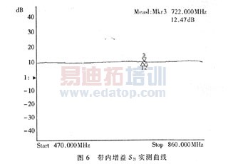 经过大量实验和反复调试,实测结果如图6所示。该驱动级放大器工作于线性状态。由图6增益曲线图可知,整个频带内增益平坦,为12DB左右,与仿真结果大致一样。回波损耗小于15DB,带内驻波比小于1.3。输入功率2瓦时,用功率计测得输出功率25W,信号幅度稳定,其交调抑制小于-35DB。各项指标满足系统要求,与国外同类数字电视发射机中放大器的指标接近,成本大大降低,为今后数字电视发射机的国产化研制奠定了基础。
