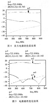 用ADS进行电路仿真并不能达到设计要求,需在此基础上进行电路优化。当只有小信号S参数作为模型来设计功率放大器时,电路优化的步骤一般为:首先尽可能以RL(相对最大输出功率的负载电阻)匹配为目标,优化和确定输出匹配电路元件值;然后再优化输入匹配电路的元件值,改善增益和输入匹配电路。需要注意的是:在优化前,必须得到尽可能完整的输出电路模型,然后在工作频率下对其优化,达到与RL的最佳匹配。图4为放大电路的仿真结果,图5为电路最终优化结果。