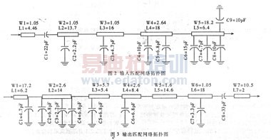 本文中的放大电路采用分离元件和分布参数元件混合使用的方法。由于电感比电容有更高的热损耗,所以在此类电路中通常避免使用电感,而使用高阻抗的传输线代替。混合类型的匹配网络通常包括几段串连的传输线以及间隔配置的并联电容。该放大器的输入匹配部分采用了四节连阻抗变换,输出匹配采用五节连阻抗变换的混合电路形式。输入、输出匹配网络拓扑图如图2、图3所示。
