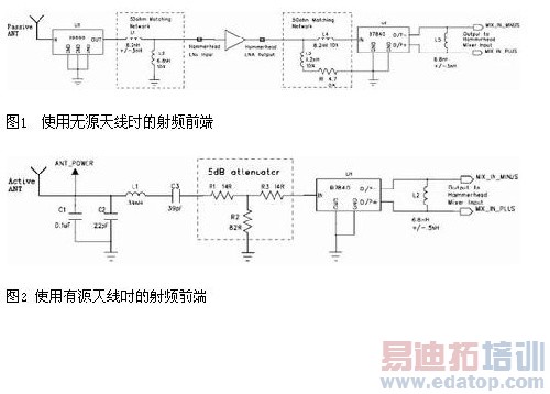 图1和图2分别是使用无源天线和有源天线时射频前端的电路图。