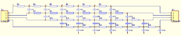 如设计一个300Hz~3000Hz的RC滤波网络,则可以去6阶的网络,各级的固有频率一次为:301Hz ,402Hz ,603Hz,1326Hz,2368Hz ,2822Hz(固定R=12K,每级电容为0.044u,0.033u,0.022u,0.01u,6800p,4700p)就可以取得较好的效果。