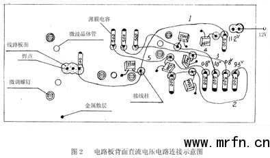 (1)将微波信号电路(含微波元器件)与直流电压电路(含滤波电路)分别设置在线路板的两个板面(正面与反面)上,并且将整个板面设计为一层良好的金属敷层(见图2),以对微波信号起到一定的屏蔽作用;