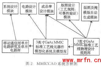 这种现代设计的基础为电子设计自动化软件和建模工具。我们针对移动通信产品开发及生产过程开展CAD开发,初步建立一个集成式的微波设计系统MMICCAD。该系统包括较为准确的单片电路器件模型系统和先进CAD软件包,是与3英寸GaAs工艺线紧密结合的CAD系统,基本上可以满足国内GaAs MMIC的设计需要。该系统方框图如图2所示。