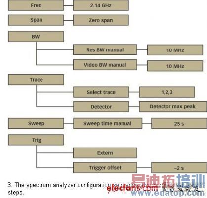 正如已经提到的一样,频谱分析器在“零档”模式下使用。不论是分辨率带宽还是视频带宽,均设为10MHz,因为频谱分析器被用来测量峰值功率。基于同样的理由,检测器必须在“最大峰值”模式下设置。选取25s的扫描时间以便获得对屏幕的整体扫描。选择外部触发器的可选项。利用“触发器偏差”特性将屏幕上的轨迹置于中心也是一种明智的选择。-2s即是合适的。图3显示了详细的配置序列。
