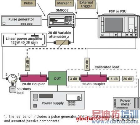 测试台(图1)使用一个与SMIQ RF信号发生器“脉冲”输入相连接的脉冲发生器。为了在功率扫描模式中使用SMIQ,功率扫描必须与信号分析器中的时基扫描同步。幸好,当与二极管检测器和类似XY模式滤波镜的显示器相关联时,这一类信号发生器具有可以被用作纯量网络分析仪(SNA)的特性。在SMIQ的后部面板上,有几个带有功率扫描斜线以驱动滤波镜的X轴的BNC连接器,以及校准显示器X轴的标记。既然这样,“标记”的输出被当作信号分析器的触发信号来使用。
