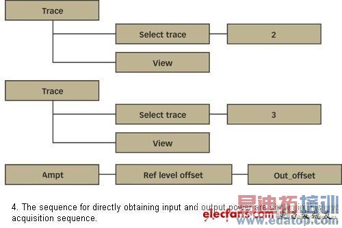 在测量之前,必须校准频谱分析器的输入输出路径。通常,DUT被一个穿透基准取代,并且信号发生器在CW模式下工作。功率计量器读取贯穿穿透基准的功率等级,而频谱分析器在“零档”模式读取输入或输出耦合器的耦合路径上的绝对功率。这样就有可能确定通向频谱分析器的输入输出路径上的衰减。称这些值为将来参数的“IN_OFFSET”和“OUT_OFFSET”。