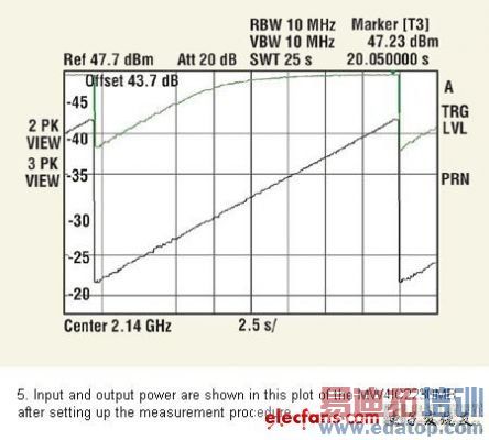 用于频谱分析器的功能序列显示在图4中。此刻,频谱分析器连接到输入,且输入功率在第二条线迹(线迹2)获取,并保持在“观察”模式。图5中的黑色线迹即得。当在输出再连接分析器之后,从第三条线迹(线迹3)获得输出功率,同样也保持在“观察”模式。通过设置“输出偏差”值的参数等级偏差,该值在校准阶段被设为43.7dB,从“线迹3”可以直接读取以dBm为单位的绝对输出功率,图5中的绿线即得。通过在锯齿末端的平面区域安置标记,可以读取如图5 中绿线所示的饱和功率。MW4IC2230MB显示+47.23dBm的饱和功率。