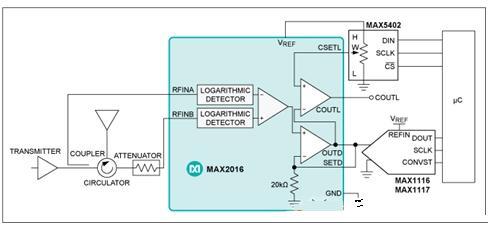 MAX2016为双通道对数检测器/控制器,它与环行器和衰减器配套使用,用于监测天线的VSWR/回波损耗。MAX2016可输出两路功率检测器的差。