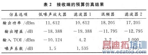 可得,系统总的IIP3=-9.75dBm。同样在模拟设计环境下,对接收端进行预算仿真,仿真结果如表2所示。