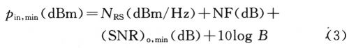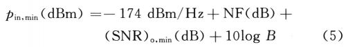 从表2的仿真结果可以看出整个接收端的增益为17.205dB,假设接收天线接收到的信号为-30dBm,则接收到的中频信号大小为-12.795dBm。中频信号的仿真值略低于中频接收端所需要的信号大小,这可以用驱动放大器来增加信号的大小。另外由仿真结果可以看出接收端总的噪声系数为4.151dB,而计算出的结果为4.12dB。仿真的接收端的三阶输入截点为-10.124dBm,而计算出的为-9.75dBm。以上结果有一定的差异,该差异是由增益压缩等因素所引起的。接收机的一个很重要指标是灵敏度,它定义为:在给定的信噪比的条件下,接收机所能检测的最低输入信号电平。灵敏度与所要求的输出信号质量即输出信噪比有关,还与接收机本身的噪声大小有关。接收机的灵敏度可由下式计算得出: