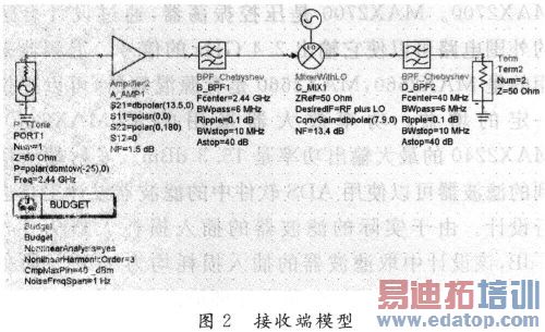 接收端在设计中要考虑增益、噪声系数、灵敏度等因素,比发射端的设计更为复杂。由于接收端包含很多有源器件,有源器件的非线性对整个接收系统会产生很大的影响,比如当只输入一个信号时会出现增益压缩,当输入两个以上的信号时会出现互相调制等。在本设计中,中频解调模块大概也需要8~10dBm的信号大小,经过分析,低噪声放大器采用的是MAX2641,MAX2641的增益为13.5dB,噪声系数为1.5dB。混频器采用的是 MAX2682,MAX2682的增益为7.9dB,噪声系数为13.4dB,本地振荡器与发送端的相同。使用ADS对接收端进行建模,如图2所示。