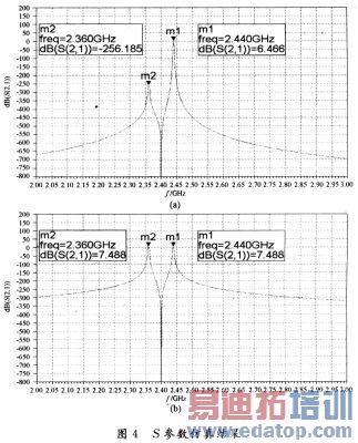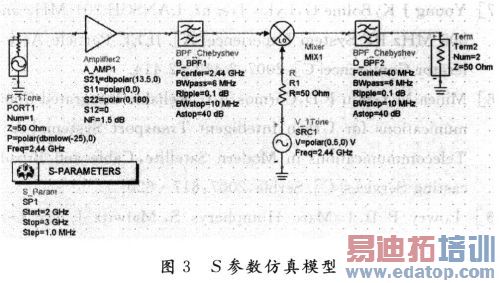 利用ADS软件对接收端进行S参数仿真,该仿真可以用于测量各个器件的S参数等。在本仿真中,可以看成是当2~3GHz,以1MHz为步长的各个频率分量通过该接收端时,接收端对各个频率分量的增益或衰减大小的仿真。仿真模型及仿真结果如图3,图4所示。