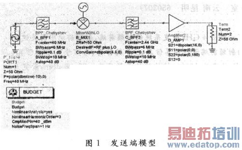 在该发射端模型中,中频信号为40MHz,-10dBm大小的信号。在ADS的模拟设计环境下,对该发射端进行设计并作预算仿真,该仿真主要是为了测量各个模块的增益、噪声系数、三阶互调截点等。该仿真过程如图1所示。