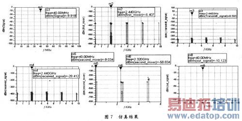 从表1仿真结果中可以看出,整个发射端的总增益为17.783dB。输入的中频信号为-10dBm,所以功率放大器输出的射频信号大小为7.783dBm。