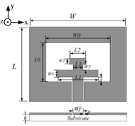天线结构如图1所示,参数L0和W0分别为矩形槽的宽度和长度,d为H型枝节和馈电线之间的距离,L1和W1分别为H型枝节下端贴片的长度和宽度,L2和W2分别为H型枝节上端贴片的长度和宽度,L3和W3分别为H型枝节中间贴片的长度和宽度。L和W分别为天线的长度和宽度。本文中,选用厚度h为1.6mm、相对介电常数为4.4(FR4)的介质板。
