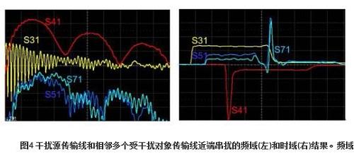 S参数中的大多数术语表示的是端口之间串扰的直接测量结果。在一条传输线上的端口1输入正弦波形,在相邻的传输线的端口3的输出之间的串扰标识为S31,而相应地从端口1输入,端口4输出的串扰则表示为S参数矩阵中的S41。