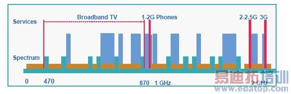 相比之下,一个移动电视接收器有更宽的频带。最初的DVB-H调谐器将需要能够调谐欧洲带有6-MHz, 7-MHz甚至8MHz信道带宽的UHF带IV-V频率(470 MHz到750 MHz)和北美地区的L-band 5-MHz(1670 MHz到1675 MHz)信道范围。这一问题在欧洲尤其棘手,因为欧洲各国频谱不统一,而且蜂窝式发射器的频段总是和移动电视的频段一致。