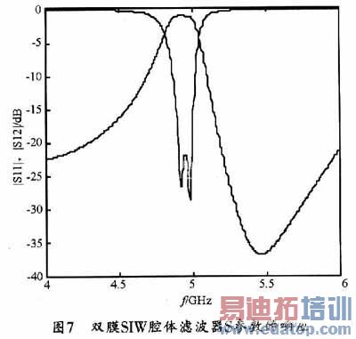 图7所示是本设计的双膜SIW腔体滤波器S参数的响应曲线。从图7中可以看出,采用本设计实现的滤波器的中心频率fo=4.95 GHz,3 dB相对带宽FBW=4.36%,通带内插入损耗为0.9 dB,反射损耗S11小于-22 dB,阻带右侧5.45 GHz处会形成一个传输零点,损耗接近-40 dB。