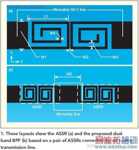 图1:版图显示了ASSR(a)和推荐的双频带带通滤波器(b), 这种滤波器采用了一对ASSR以及与之相连的微带