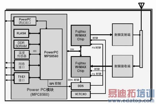 参考设计中的主要模块包括无线通讯板、 WiMAX SoC、以太网和串行端口、电源模块以及时钟发生电路。应用软件和MAC功能采用板上闪存和SDRAM。DDS为ADC和DAC提供采样时钟,不过,只有 在设计必须支持多信道带宽时才会用到。如果信道带宽是固定的,可以用一个简单的时钟源取代DDS,以降低成本。采用外置处理器的富士通TDD基站参考设计 如图2所示。