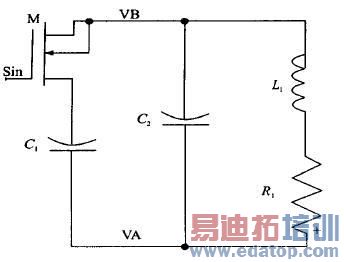 调制电路用来将数字部分的输出信号叠加到载波上,以便于发射。调制可分为两步,第一步,数字信号对副载波进行BPSK 调制,第二步,将BPSK调制输出的数字信号进行ASK 调制后经天线发射出去。其中BPSK 调制放在数字部分实现。在射频端,所要实现的是利用经BPSK 调制后的输出信号(依然为数字信号,只不过频率为副载波的频率)再对射频载波进行ASK 调制。调制电路采用的是电容负载调制,电路原理图如图3 所示。电路中,LCR谐振回路中总电容的大小取决于M 导通与否,利用数字信号Sin 控制开关管M 的通断,从而决定了谐振回路电容值的大小(M 导通时,总电容值为C1+C2,M 关断时,总电容值为C2) ,从而使得LCR 回路的谐振点频率随数字信号电平不同而变化,对于特定频率的外部射频信号,感应信号电压幅度随数字信号电平值的变化而变化,从而实现了类似A SK 的负载调制。