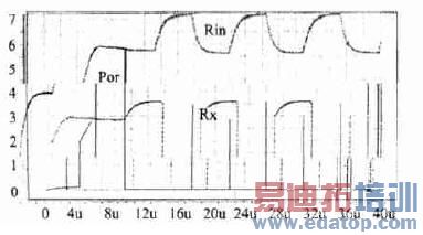 设计中,对射频前端电路各子模块以及整个系统均进行了详细的性能模拟,模型参数采用上华0.8 um CMOS 模型参数库。在此给出比较关键的接收解调和调制输出这两部分性能模拟结果。对于接收解调而言,其接收到的信号调制指数在8%~12% 之间,数据传输速率为106 kbps,外加一个指标类似的调幅波进行解调性能验证,在输入调幅波调制指数为10% 时对应的模拟波形如图6 所示。其中Por 为上电复位信号,解调部分仅在数字部分复位后才开始工作,R in 为包络检波电路输出的包络信号,Rx 为解调输出的数字信号。