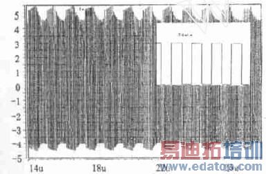 对于信号发射通路,主要是信号的调制问题,BPSK 调制放在数字部分,调制输入数字信号频率为副载波频率(f c/16≈ 847 kHz) ,对应调制输出模拟结果如图7所示。图中交流信号Tx 是天线输出的调幅信号,其上叠加了经BPSK 调制的副载波信号Tdata (如空白处所示)。