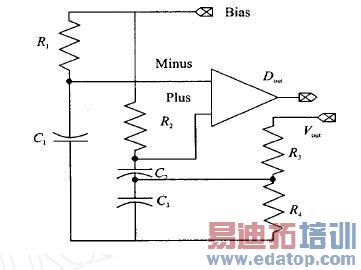 解调电路从读卡器发射的ASK 信号中恢复出数字信号,因此解调部分只需利用一个包络检波器取出包络,然后经比较器与基准电压比较即可恢复出原来的数字信号。可以看出,由于读卡器发射信 号采用10% ASK 调制,因此相对简化了卡上解调电路。此处采用了两个改进半波整流电路(如前所述) 来构成包络检波器,如图4 所示。在该电路中,V A、VB 之间为天线感应的外界场信号(为10% ASK 调制信号) ,此时V SS端对应该调幅信号的最低端,而V out对应该信号的最高端(由于晶体管的阈值损失,因此这两个电位与调幅信号的高低峰值相差一个V th ) ,由于V SS为卡上电路的公共接地端,故此对应的检波输出信号V out 在不同数值(“1”或“0”) 时起伏更为剧烈,从而降低了对解调电路比较器灵敏度的要求。一关键问题是如何确定包络检波输出信号的中心电压(平均值) ,用它作为比较器的基准电压,完成模数转换。由于影响包络幅值的因素很多,比如信号强弱、工作距离的远近等都会使场磁信号的幅度发生变化,因此很难确定其 平均值。为此设计了一种自适应比较电路,原理如图5。在该图中,V out为图4 所示包络检波电路的输出,Dout为解调后输出数字信号,Bias 为片上一稳定偏置电压(由解调基准电压产生电路产生)。很显然,在稳态时,比较器两个输入端Minus、Plus 电压均为偏置电压Bias。而在接收到调幅信号时,由于包络检波输出Vout出现波动,该波动通过电容C2耦合到比较器Plus 端,使该端电压随Vout起伏而起伏,而Minus 端电压则一直等于Bias 端电压,比较器检测出包络起伏,完成了数字信号的解调。