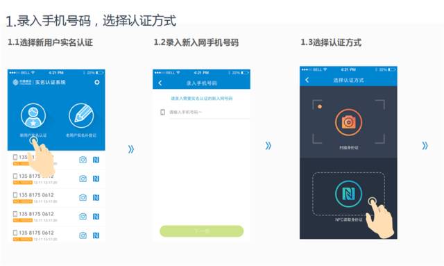 1新用户实名认证。打开APP后,选择新用户认证,然后录入新入网手机号,选择认证方式【扫描身份证】,依次扫描身份证的正反面核对信息后即可完成验证。