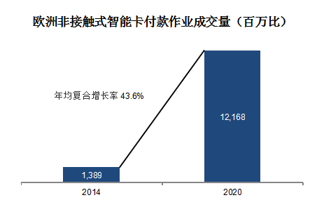 RBR研究表明,2014年欧洲非接触式智能卡付款作业成交量达到1,400,000,000笔,交易金额总值达到15,000,000,000欧元,成交量比2013年增长155% ,交易金额总值增长190%。非接触式交易看似增长率惊人,事实上仍然只占欧洲支付卡成交总量的2%,占交易金额总值的0.5%。据预测,2020年非接触式付款作业将同比增长近8倍,达到12,200,000,000笔,届时此类成交量将占支付卡成交总量的13%。非接触式智能卡使用率的快速增长得益于逐步扩大的受理范围与消费者对于此类技术的不断熟悉、以及行业的宣传。
