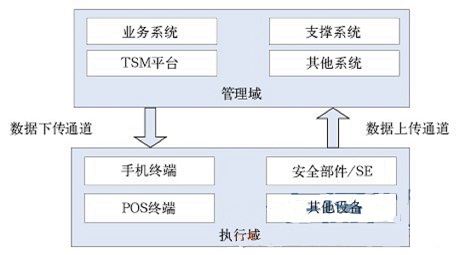 基于上述NFC业务运营的角色需求,我们将NFC业务系统模型分为管理域和执行域两大部分,分别通过数据上传通道和数据下传通道进行连接,如图 2所示。1)管理域。面向NFC业务的运营和开展,进行业务管理、用户数据的处理等,是对应系统架构图的NFC业务平台。2)执行域。面向用户的NFC生态环境,真正贴近用户本身,开展具体的基于NFC技术的业务;对应系统架构图的智能信息终端和智能终端。