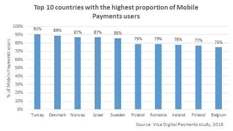 在国家情况方面,调查数据表明,土耳其的移动支付用户比例最高,达到91%,紧随其后的是丹麦的89%,挪威和以色列为87%、瑞典86%、波兰和罗马尼亚79%、爱尔兰78%、芬兰77%以及比利时为75%。