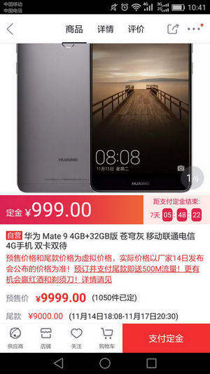 在其他方面,MATE 9采用1080P 5.9寸屏幕,二代徕卡双摄,基于Android 7.0的EMUI 5.0等。除了普通版,MATE 9还有保时捷设计款,最大的变化是配备了5.5寸2K级别双曲面屏,欧版售价过万。目前国行版MATE 9正在京东预售价9999,价格打破了华为手机以往的定价记录。