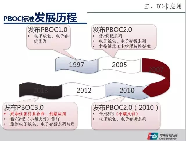 关于PBOC标准。97年发布的是1.0,是基于银行自己发行的,所以应用前景不广。一般做行业、客户应用,比如说社保、交通领域应用;PBOC2.0发布以后就不一样,基于银联的网络环境,PBOC2.0基于公私钥对,这对安全性带来很大的突破;到后来发布2.0借贷记也慢慢淘汰了;PBOC3.0发布以后,跟行业应用就更密切了。