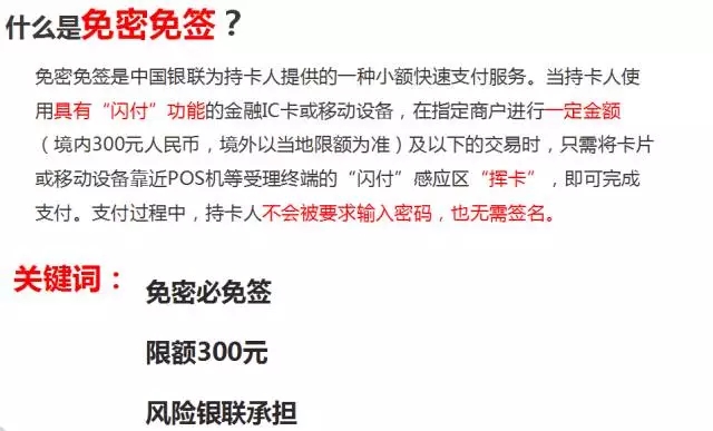 接下来讲一下持卡人的免签、免密、闪付功能的卡,在制定商户进行一定的金额(300元人民币境内,境外以当地限额为准)及以下交易时,只需要将卡片或者移动设备靠近POS机等受理终端的闪付感应区挥卡,即可完成免密支付,不需要输入密码、不需要签名。对于这种商户是有严格限制,而不是所有人都能够开一个POS,大家知道网上可以随意买卖POS机,而且你也毫不知情,一些普通第三方机构不考虑风险,你多少钱买一台可以使用、刷卡。