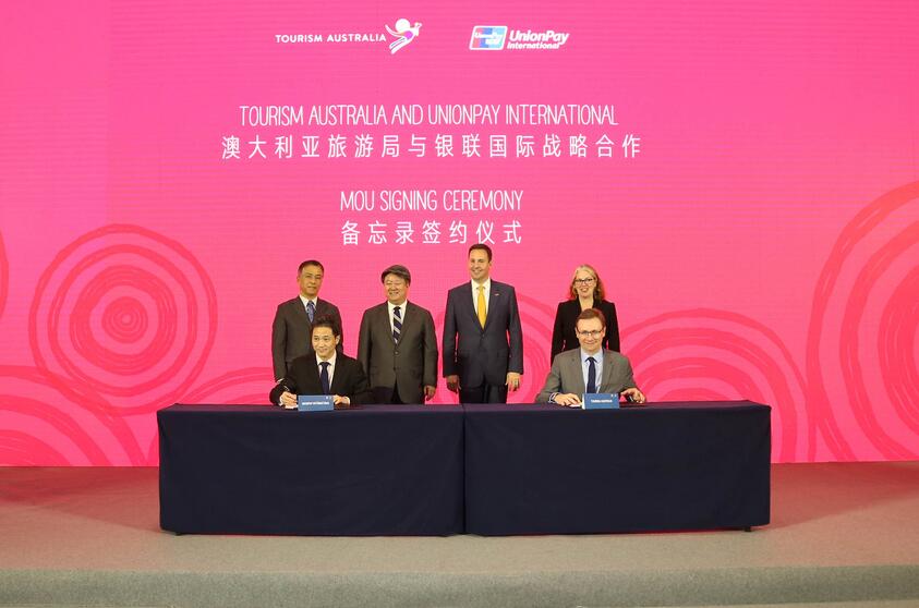 银联国际与澳大利亚旅游局昨天在北京签署合作备忘录,未来三年将在银联卡用卡宣传、签证支付便利、旅游信息共享等方面深化合作。银联国际首席执行官蔡剑波、澳大利亚贸易、旅游和投资部部长史蒂文乔博(Hon. Steven Ciobo)、澳大利亚旅游局局长约翰欧肃文(John O39;Sullivan)、澳大利亚驻中国大使安思捷共同出席仪式。