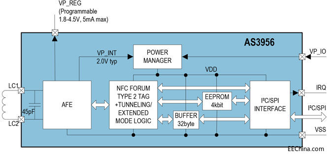 AS3956的各种功能为设计师实现基于NFC的应用带来更多灵活性,包括为主微控制器提供I2C和SPI接口以及1.65V-5.5V的宽电源电压。